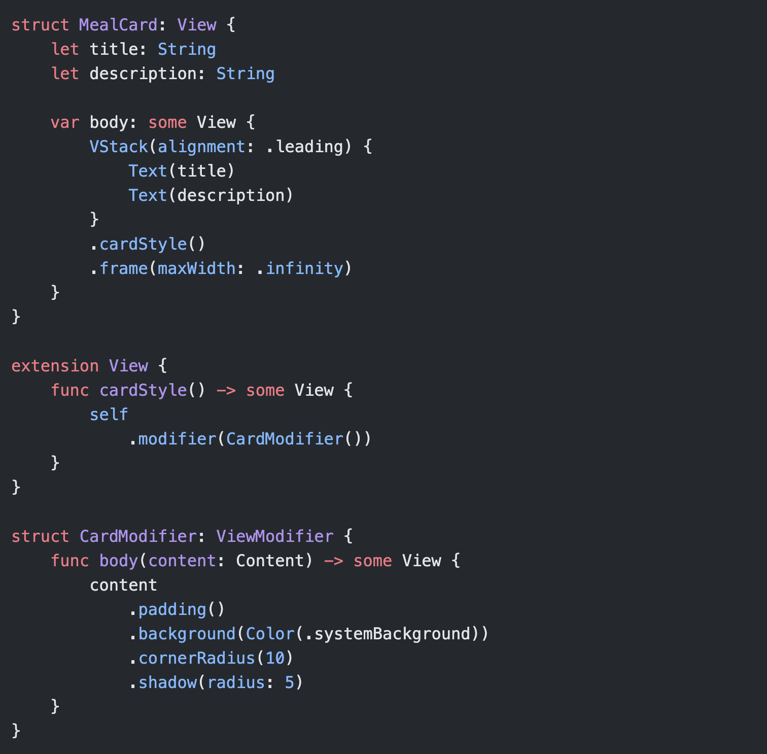 Utilizing SwiftUI, a similar Card view would have to be custom created in order to match the Jetpack Compose version. This can be done a few ways, but I’ve included an example of using a custom modifier (with the help of the expert iOS developers at Atomic Robot)