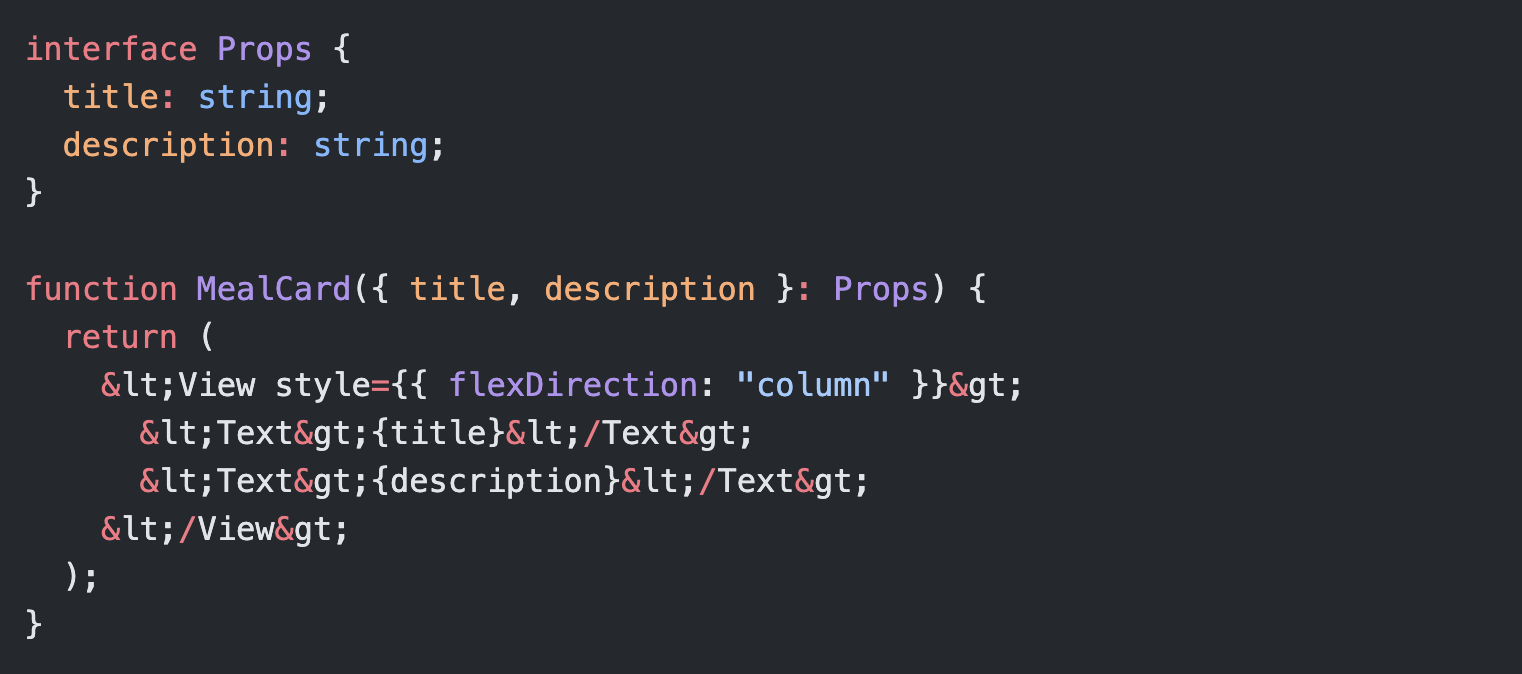 Creating a similar cross-platform view in a React Native project, the pattern is remarkably similar yet has a hint of web-like tags. I struggled most here with Typescript as it is also my first experience with this language.