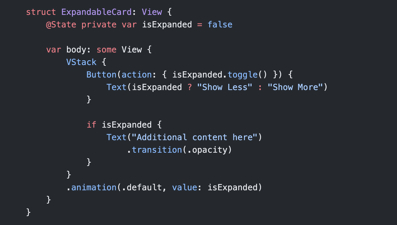 Swift uses a @State property wrapper. This allows for direct mutation of a boolean state like isExpandedwith .toggle()